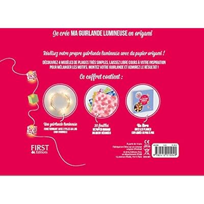 Un superbe coffret pour personnaliser une guirlande lumineuse avec du papier origami !Quoi de plus tendance qu'une guirlande lumineuse pour éclairer et embellir son intérieur ? Grâce à ce coffret, découvrez quelques modèles de pliages très simples, laissez libre cours à votre inspiration pour mélanger les motifs, montez votre guirlande et admirez le résultat ! Le coffret contient : - une jolie guirlande lumineuse fonctionnant avec 2 piles AAA (non fournies) - 20 feuilles de papier origami, avec des motifs inédits et originaux de Lisa Magano ! - 1 livret avec les pliages expliqués en pas à pas